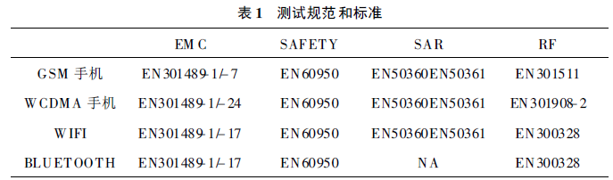 手機(jī)CE認(rèn)證的測試內(nèi)容有四部分,分為EMC (電磁兼容)、SAFETY (安規(guī))、SAR (比吸收率)、RF(射頻)。每部分所對應(yīng)的測試規(guī)范和標(biāo)準(zhǔn)見下,表1