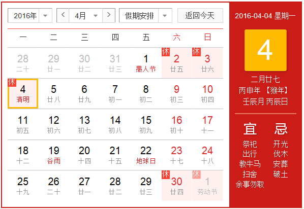 2016清明節(jié)放假時:201642——44周六、周日周一共三天。