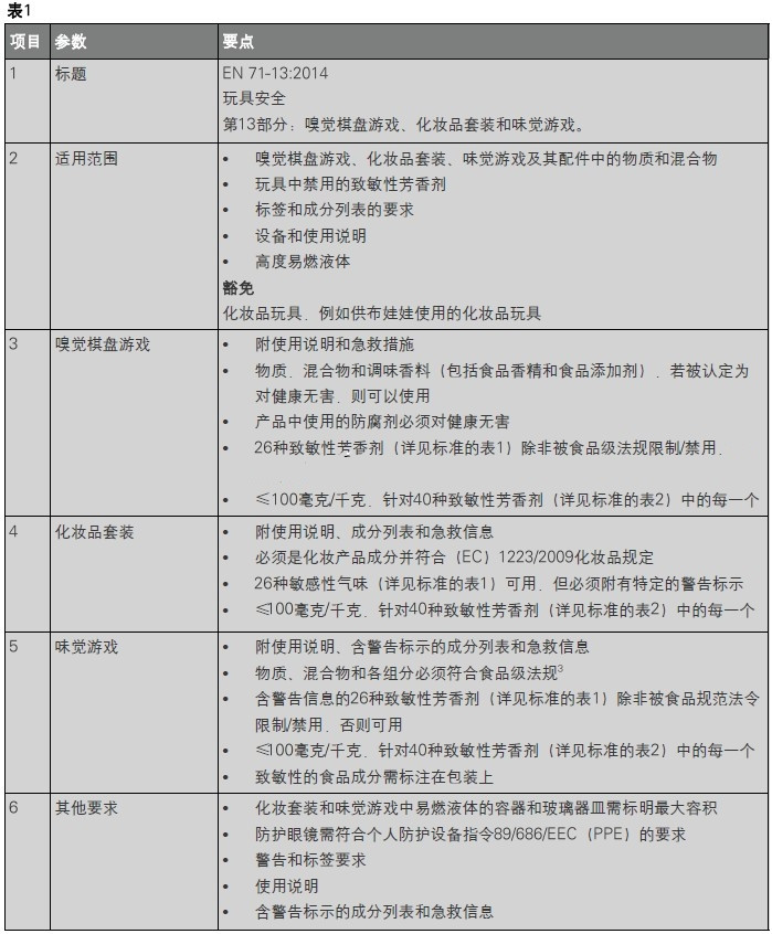 2014326日,CEN發(fā)布了一項全新的玩具安全標(biāo)準(zhǔn)EN71-13:2014,以規(guī)范嗅覺棋盤游戲、化妝品套裝,味覺游戲以及此類游戲或套裝的配件中所用物質(zhì)和混合物的要求。該標(biāo)準(zhǔn)同時還規(guī)定了玩具中禁用的致敏性芳香劑、標(biāo)簽、成分列表、說明書、活動中將要使用的設(shè)備和高度易燃液體的使用等要求。